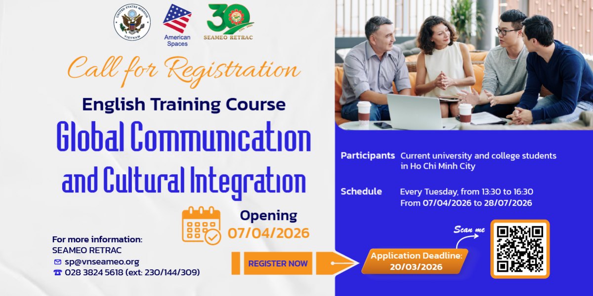 SEAMEO RETRAC, in collaboration with the American Center in Ho Chi Minh City, is pleased to announce the “English Training Course on Global Communication and Cultural Integration.” CourseObjectives: Enhance Language Proficiency: Improve English skills for effective communication in academic, professional, and cultural exchange environments. Develop 21st-Century Skills: Cultivate essential skills, including communication, teamwork, creativity, and critical thinking. Broaden Cultural Horizons: