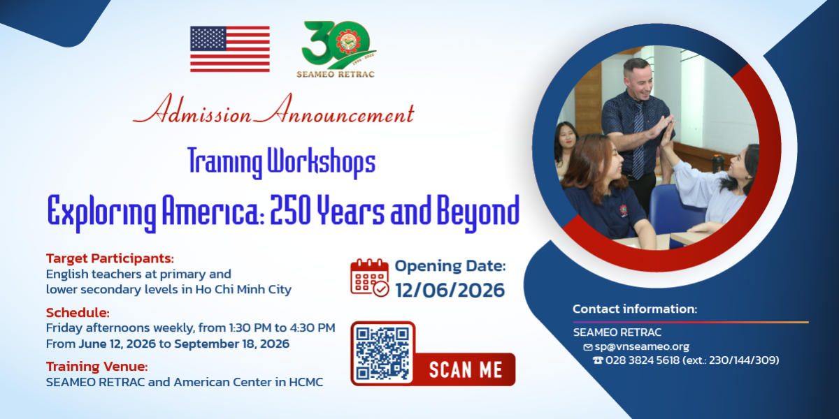 Admission Announcement for the Training Workshops – Exploring America: 250 Years and Beyond The program is implemented by SEAMEO RETRAC with support from the U.S. Consulate General in Ho Chi Minh City. Target participants: English teachers at primary and lower secondary levels in Ho Chi Minh City 🎯 Objectives: ✅ Enhance their English teaching capacity through integrating America250 themes of culture,